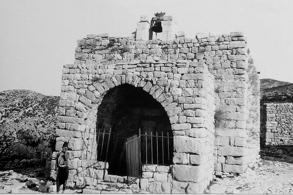 ويتابع قائلاً إنّها ذات حنيَّةٍ مكوَّرة مكسوَّة بالرّسوم، وعلى مذبحها كتابات لاتينيّة أشار إليها إرنست رينان، مضيفاً أنّ رسومها قد تكون متَّصلةً بالفنّ السّريانيّ المقدَّس القديم. وهذا ما ذهب إليه أيضًا تقريرالخبير شارل دييهل الّذي رفعه إلى الأكاديميّة الفرنسيّة في باريس عام 1927، والّذي أشار اليه الأب يوحنّا صادر موافقًا على ما جاء فيه من أنّ هذه الجداريّات تعود في أصولها إلى الفنّ السّريانيّ. ولكن، خلافاً لما ورد بالنّسبة إلى الكتابات اللّاتينيّة المحفورة على قاعدة المذبح، فان هذه الكتابات، بالتّأكيد، هي بالأحرف اليونانيّة وتذكّر بما معناه "الإيمان عطيّة الله". أمّا تكويرة الحنيَّة فتبدو كأنّها المدخل الرّئيس للرّسومات إذ تتناول موضوع التّجسّد في قسمَيه العهد القديم والعهد الجديد.