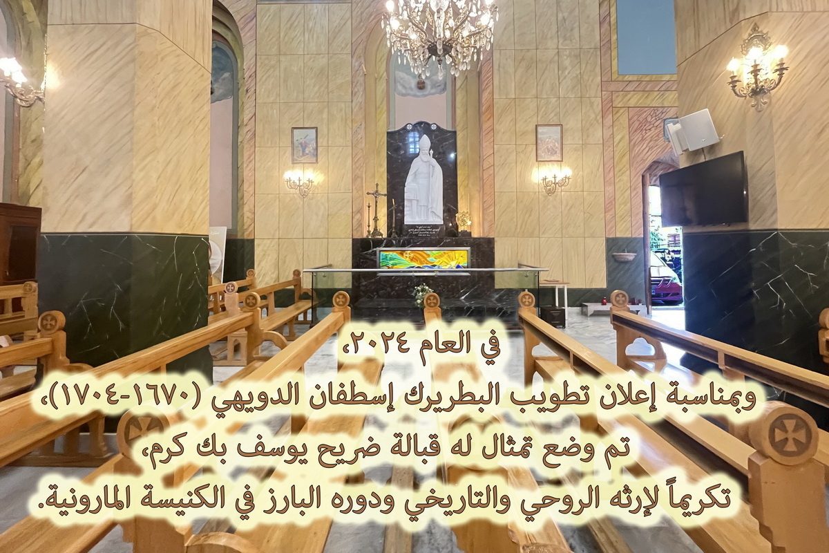 وفي العام 2024، وبمناسبة إعلان تطويب البطريرك إسطفان الدويهي (1670-1704)، تم وضع تمثال له قبالة ضريح يوسف بك كرم، تكريماً لإرثه الروحي والتاريخي ودوره البارز في الكنيسة المارونية.