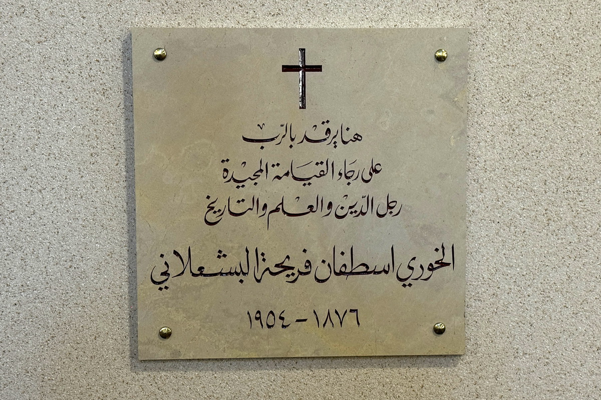 «هنا يرقد بالرب على رجاء القيامة المجيدة رجل الدين والعلم والتاريخ الخوري اسطفان فريحة البشعلاني 1876 – 1954".